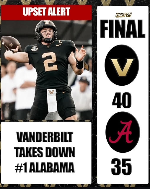 Vanderbilt pulled off a stunning upset against No. 1 Alabama today, winning 40-35. The Commodores jumped out to a 13-0 lead early, including a pick-six on Alabama’s first possession. Vanderbilt’s quarterback, Diego Pavia, was nearly flawless, throwing for 252 yards and two touchdowns, while also rushing for 57 yards. A crucial 35-yard touchdown on a 4th-and-1 play in the third quarter helped secure Vanderbilt’s first-ever victory over a top-ranked team in what is now one of the biggest upsets in college football this season.